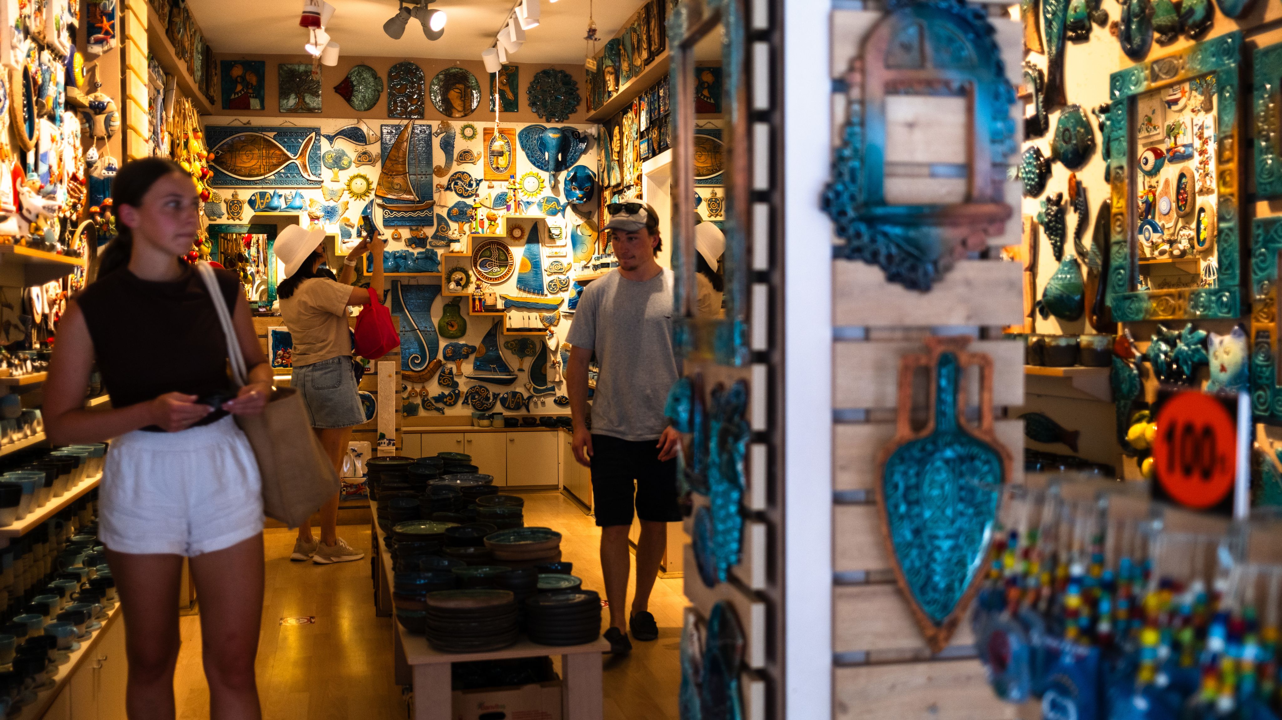 We decided to leave the market and began hunting for a place to eat, our stomachs rumbling after the morning’s walk. Choosing a different route down to the harbor, we passed numerous stores selling colorful Turkish lamps and vibrant trinkets, the streets overflowing with textures and colors that seemed to beckon from every direction.