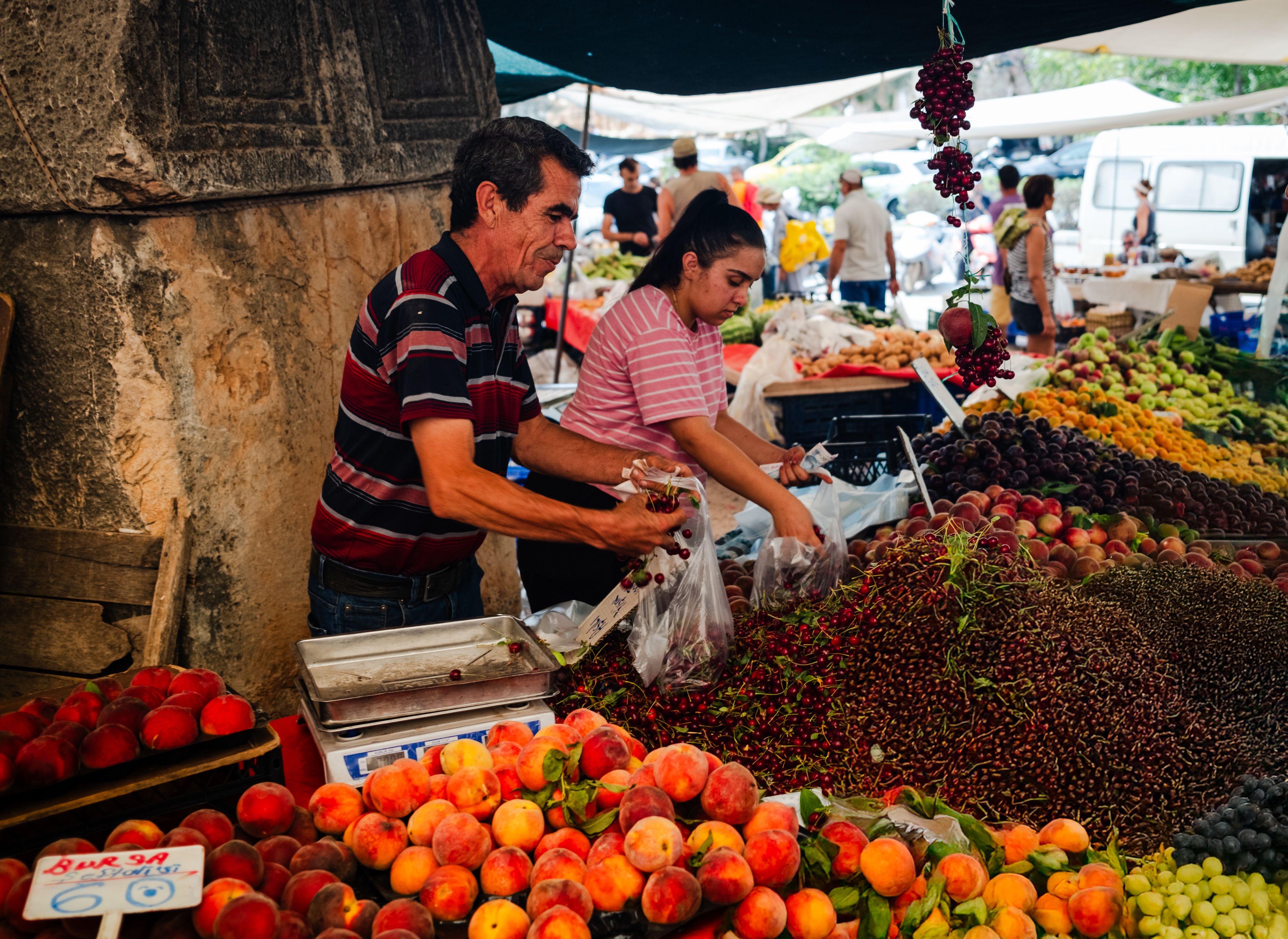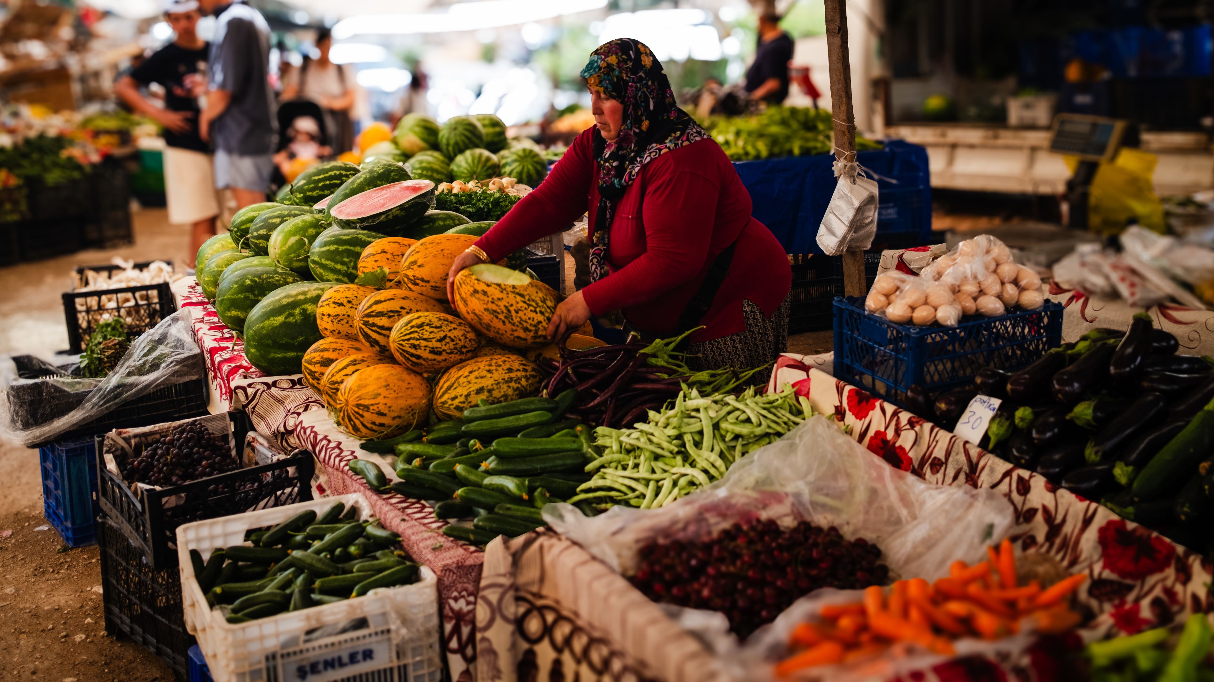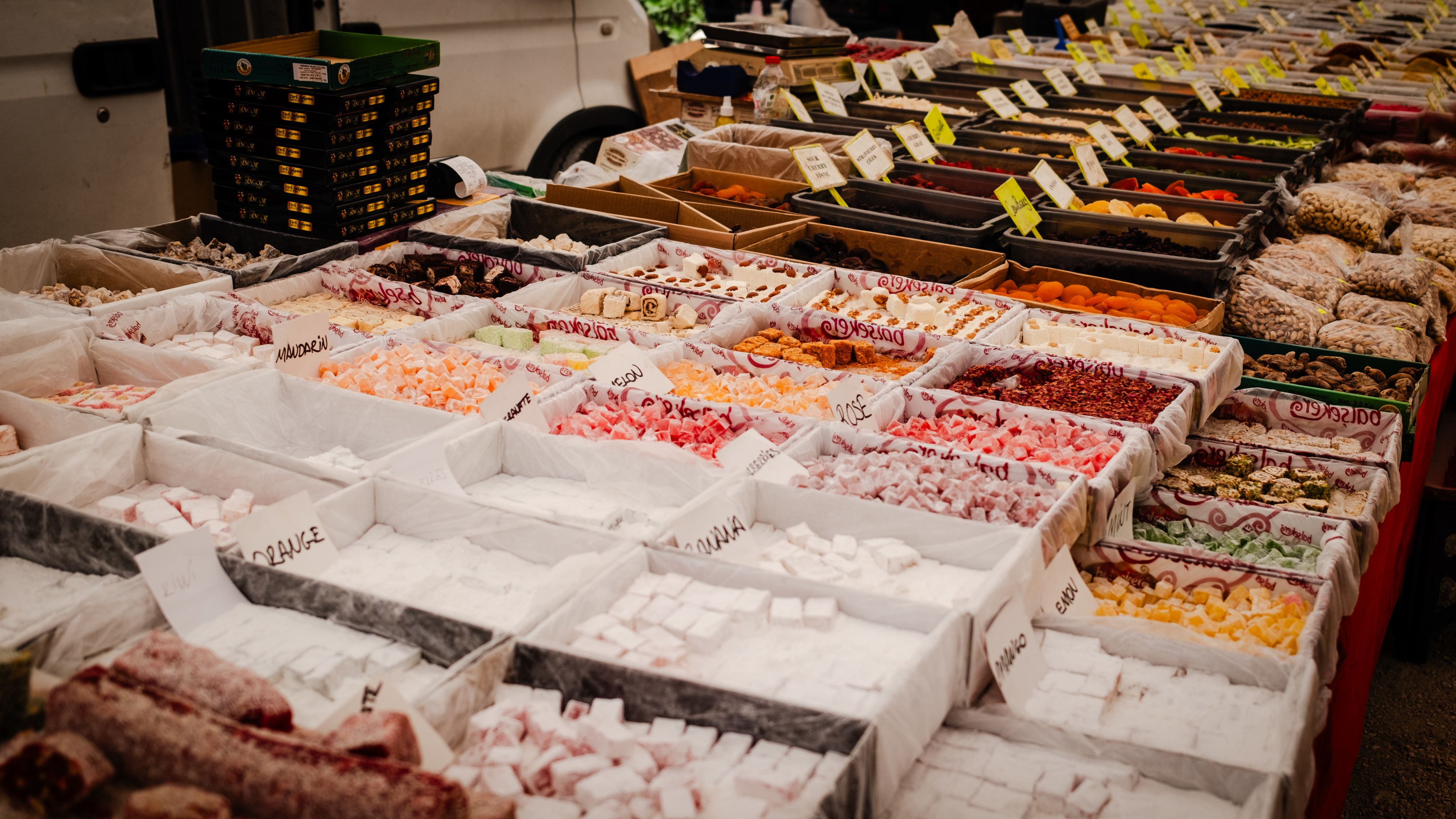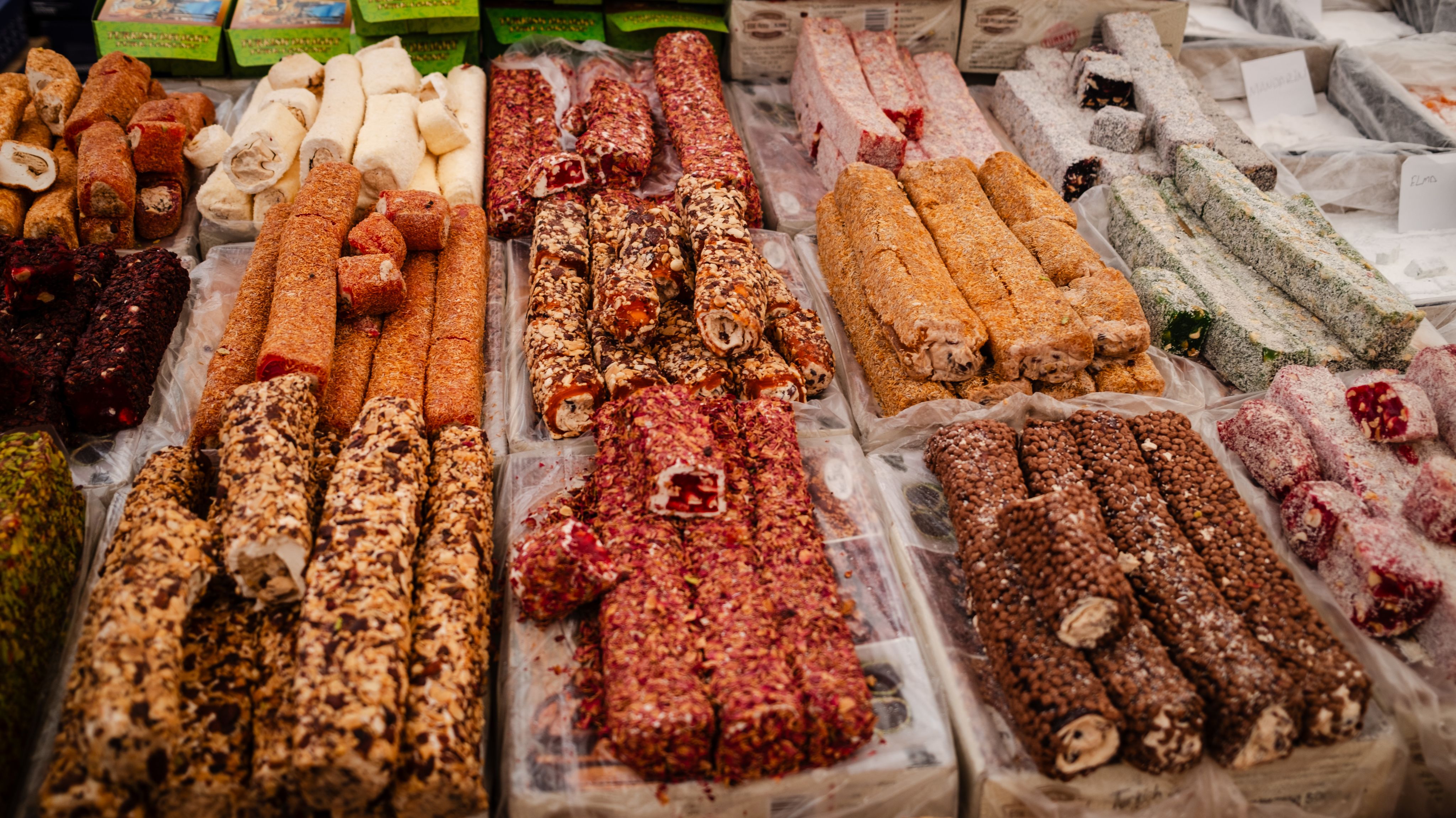 Entering the market, we found ourselves beneath a massive white tent. Inside, we wandered through endless stalls offering fresh fruit, vegetables, nuts, grains, spices, and, of course, Turkish delights. The market was far larger than I had imagined, also selling trinkets, clothes, bags, and shoes.