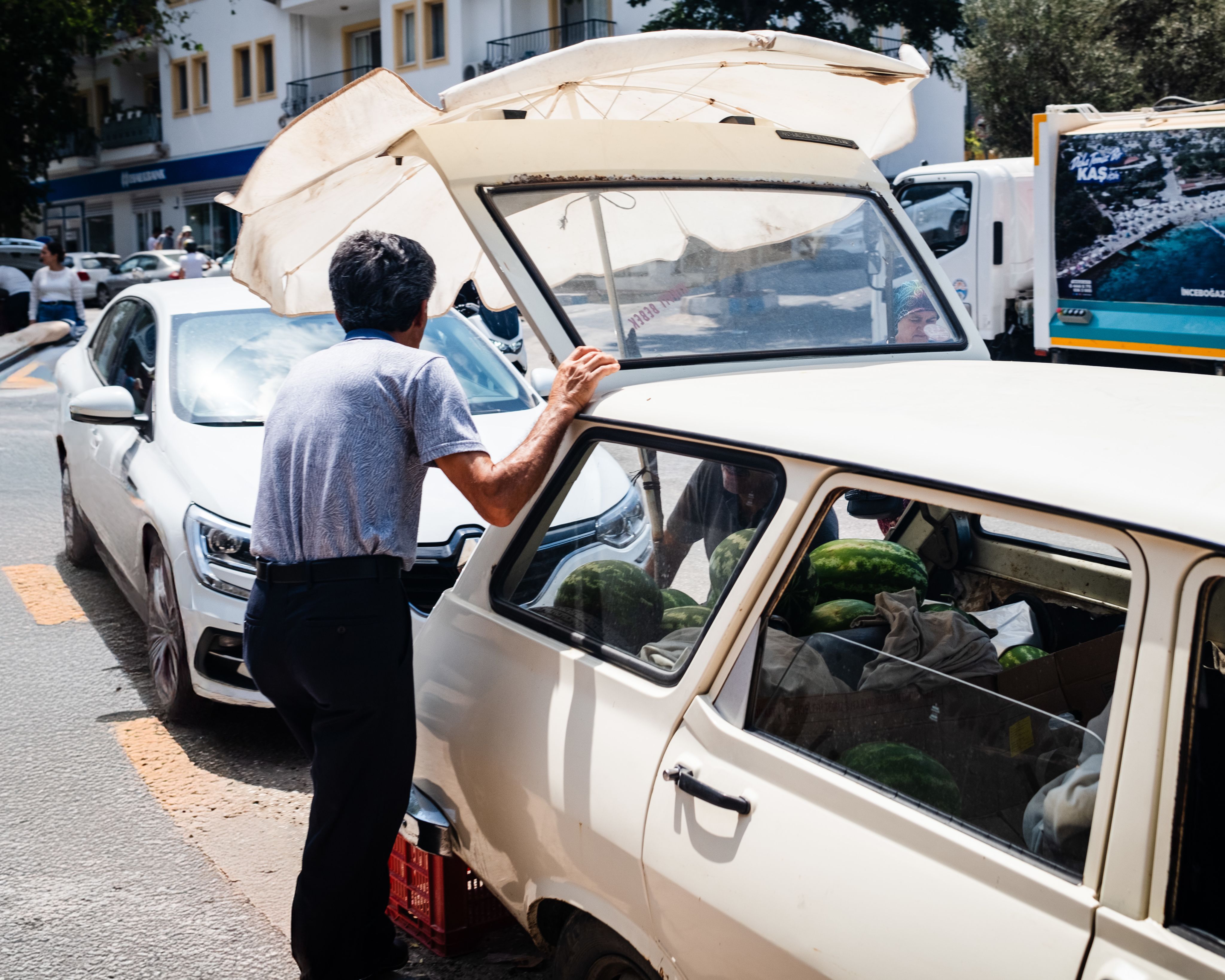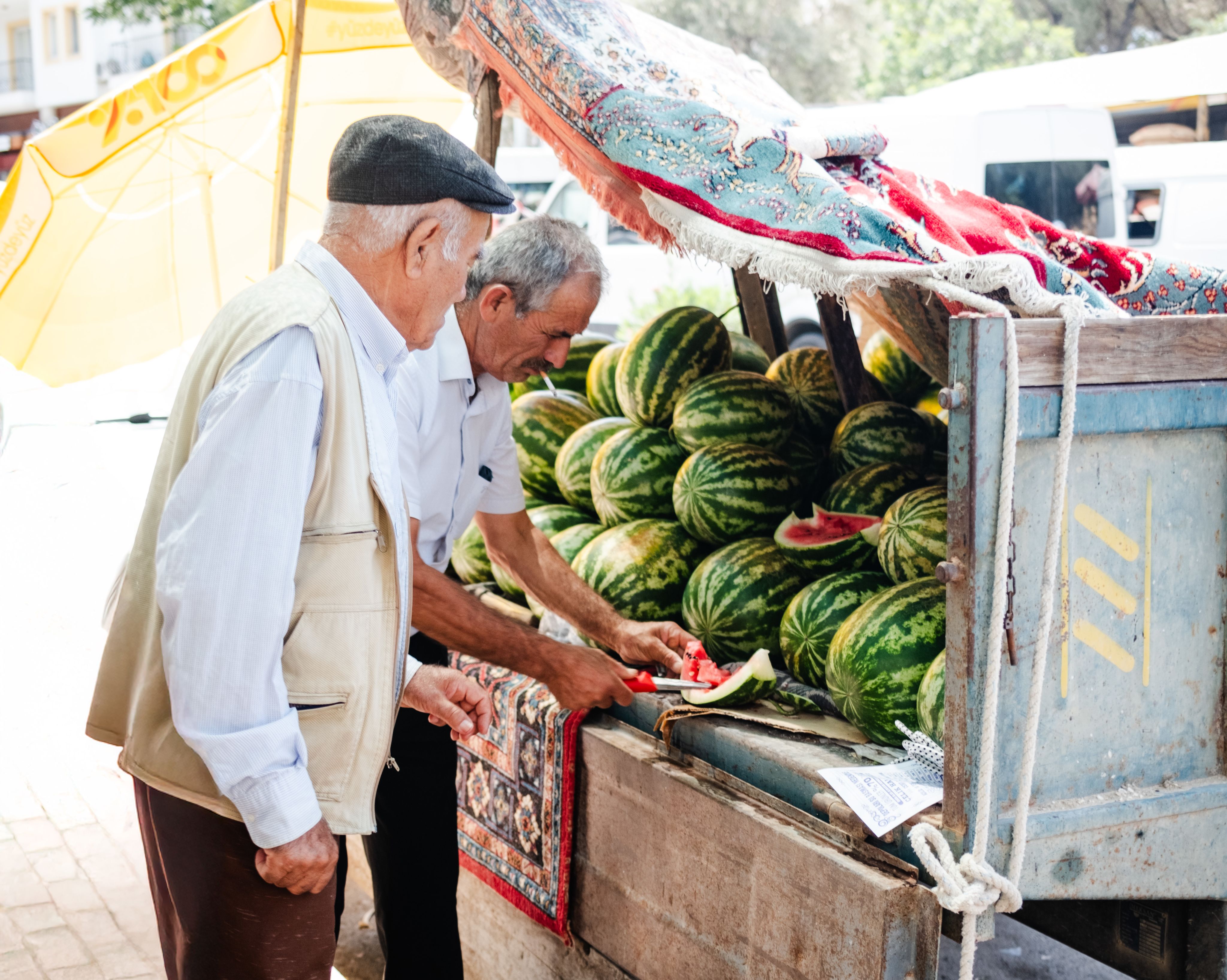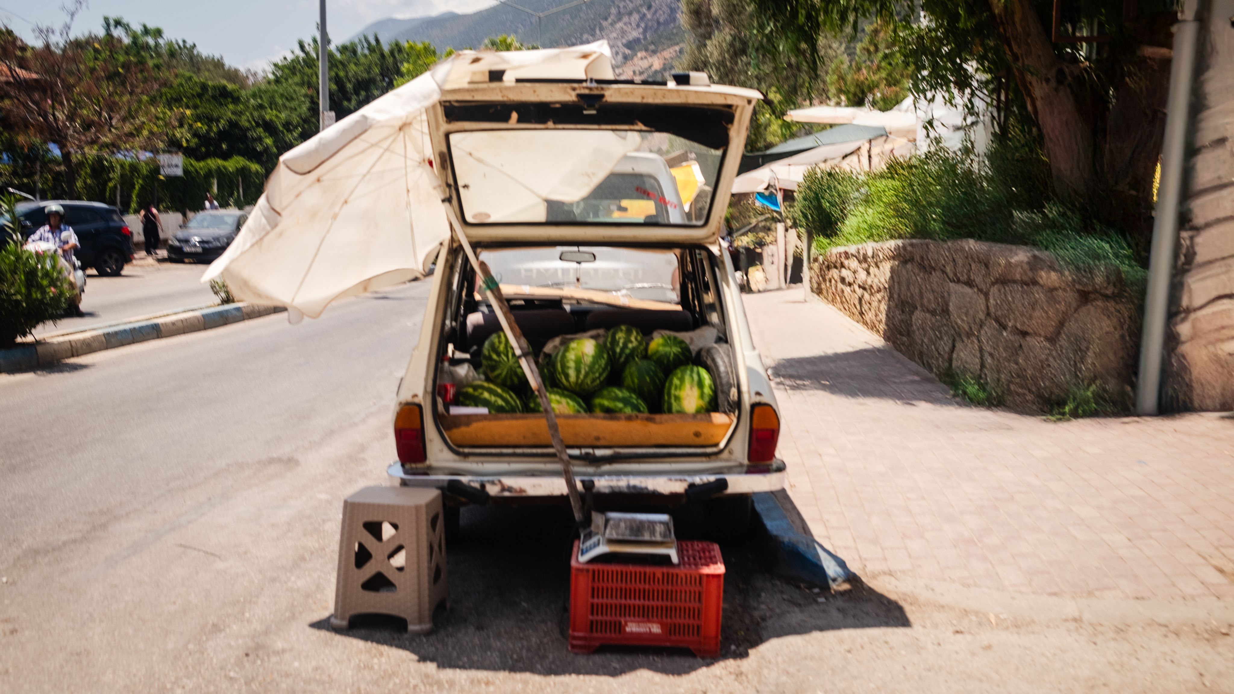 Nearby, two men were selling whole watermelons out of the back of a truck, using Turkish carpets as a cover.