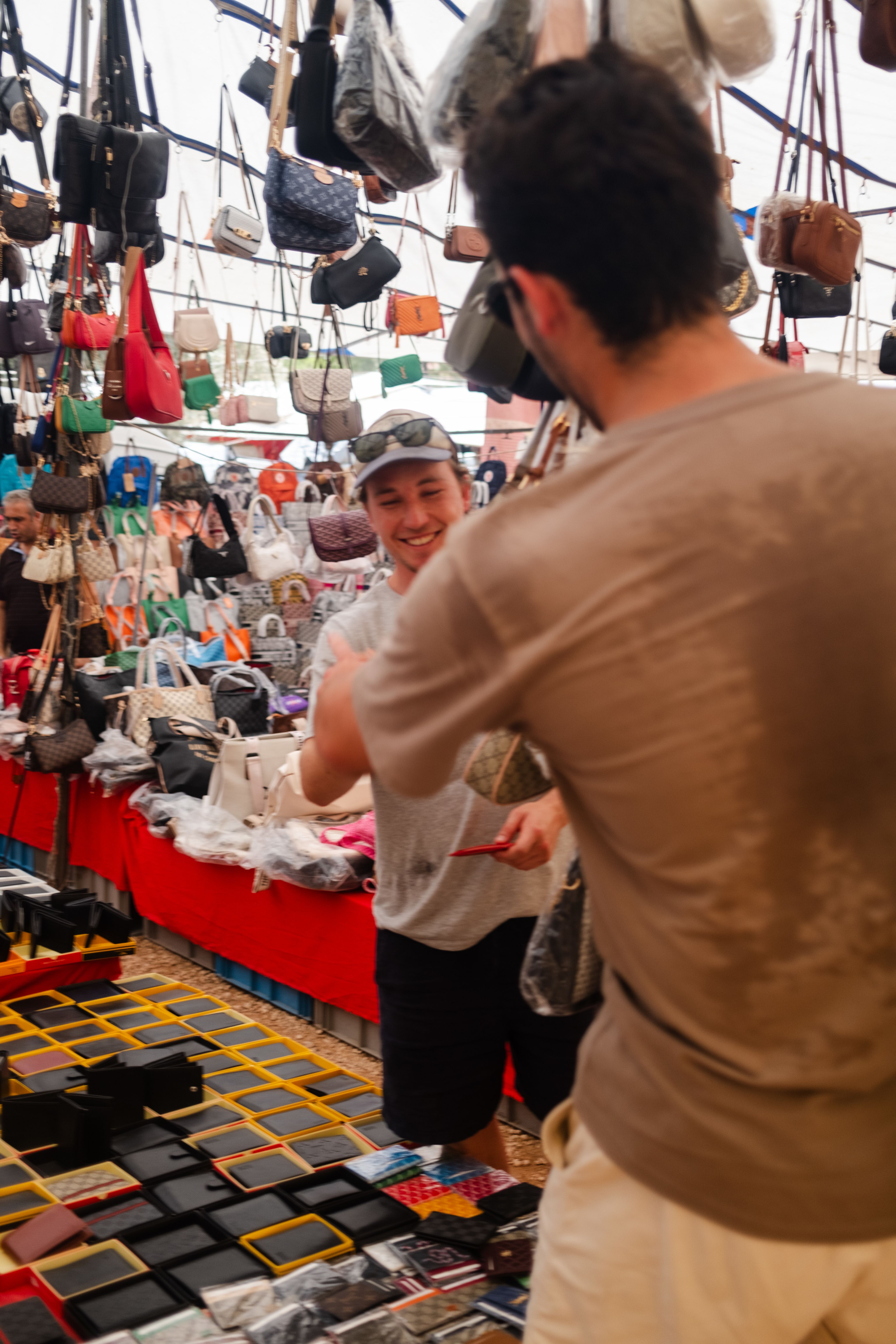 While Harry Mclarty, Luca La Ferla, and I were content to browse the market for fun, Sophie Berry was on a mission—searching for a Goyard bag, that looked somewhat 'real'. After combing through every stall, her disappointment was evident and she admitted defeat.