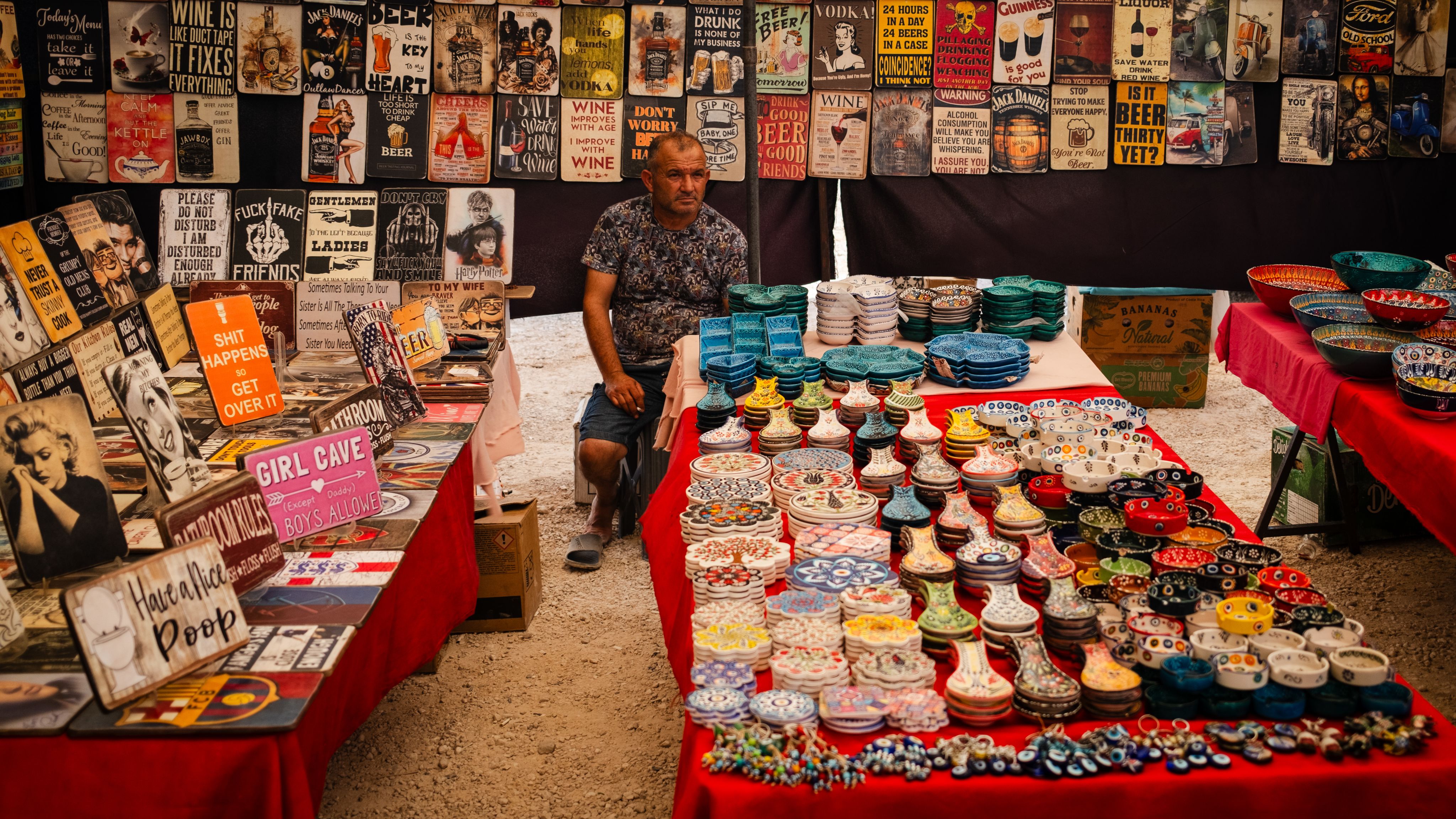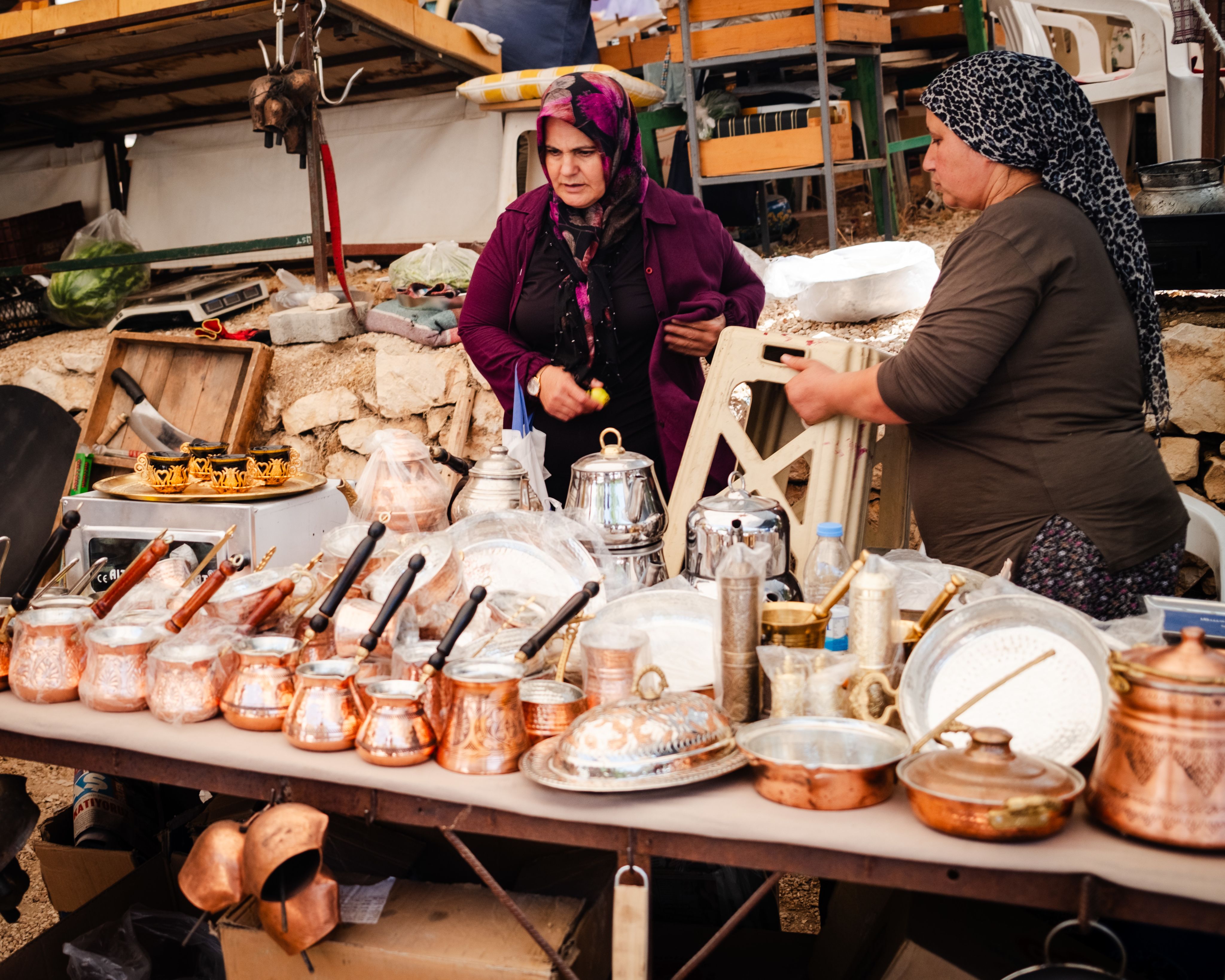 As we neared the market entrance, a lady sold rose-gold pots, pans, and jugs, her trinkets gleaming in the sun.