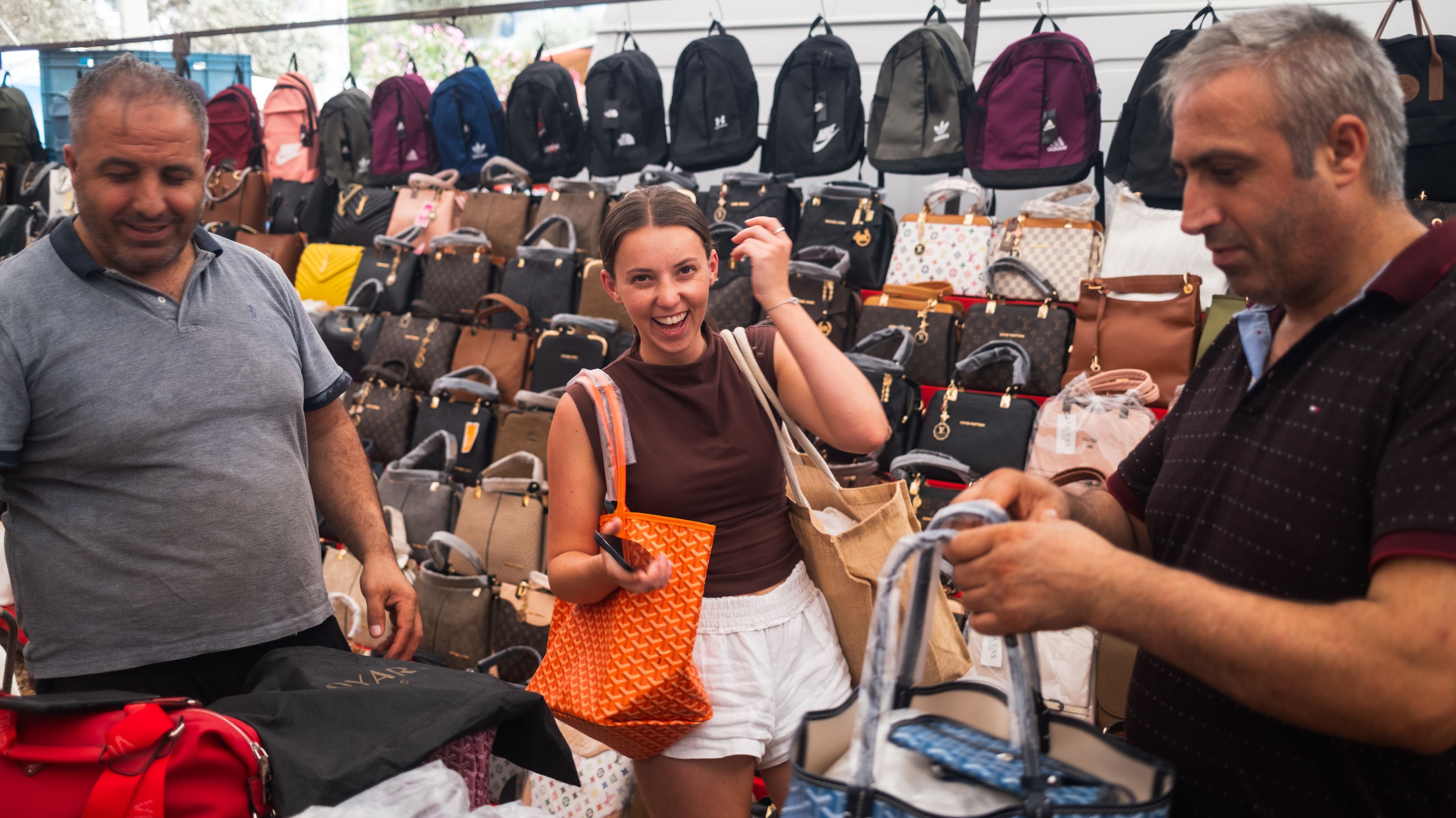 We had all pretty much had it, when she finally came across a bag that met all her criteria. The vendor eagerly demonstrated the bright orange bag’s durability, performing a “scrunch test” and showcasing various ways to wear it. Berry and Mclarty began bargaining with the seller, pushing for a two-for-one deal before settling on a price for the bag alone.