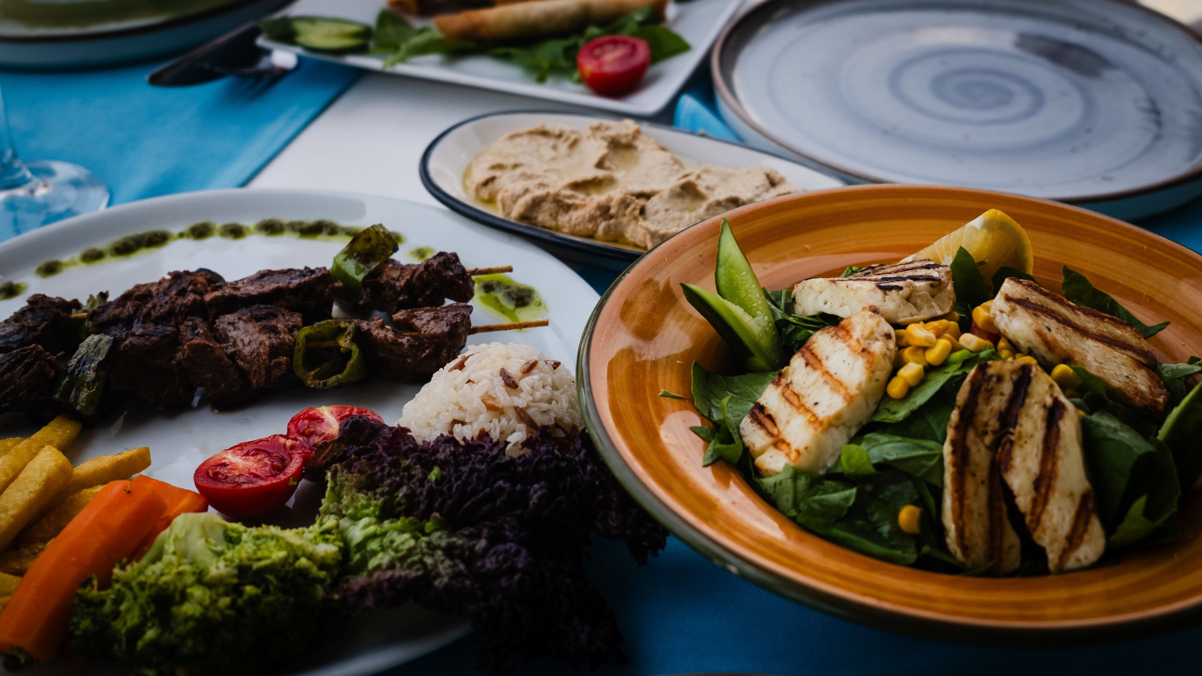 We ordered several plates to share: charred halloumi on a bed of salad, pita with hummus, and kebabs. The food was simple but tasty.